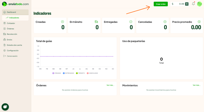 1. Para crear tu primer envío en enviatodo.com, da clic en el botón de CREAR ORDEN.