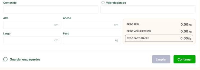 Debajo de estos apartados la plataforma te va a detallar cuanto pesa, cual es el peso volumétrico y el peso facturable.